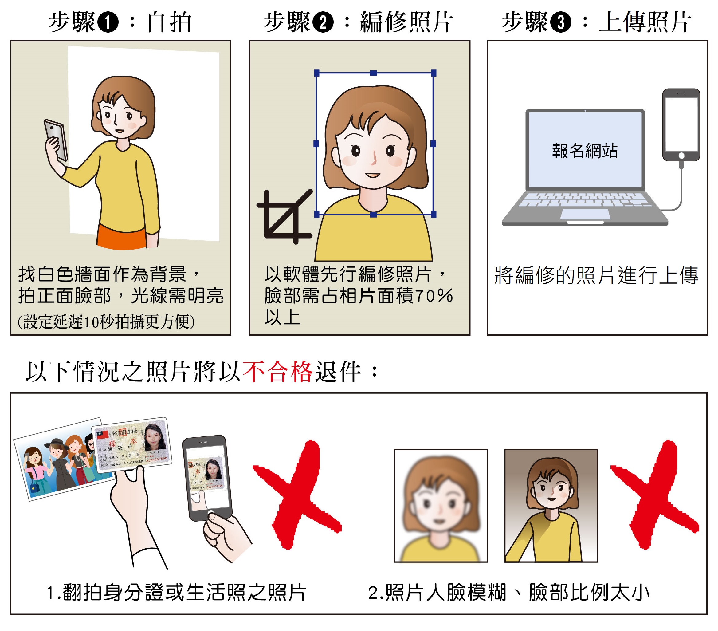 請依據簡章及線上報名程序確實填寫各項報名資訊,及上傳本簡章所訂定之報考應備證明文件,並拍照上傳照片 (頭部至肩上) 。